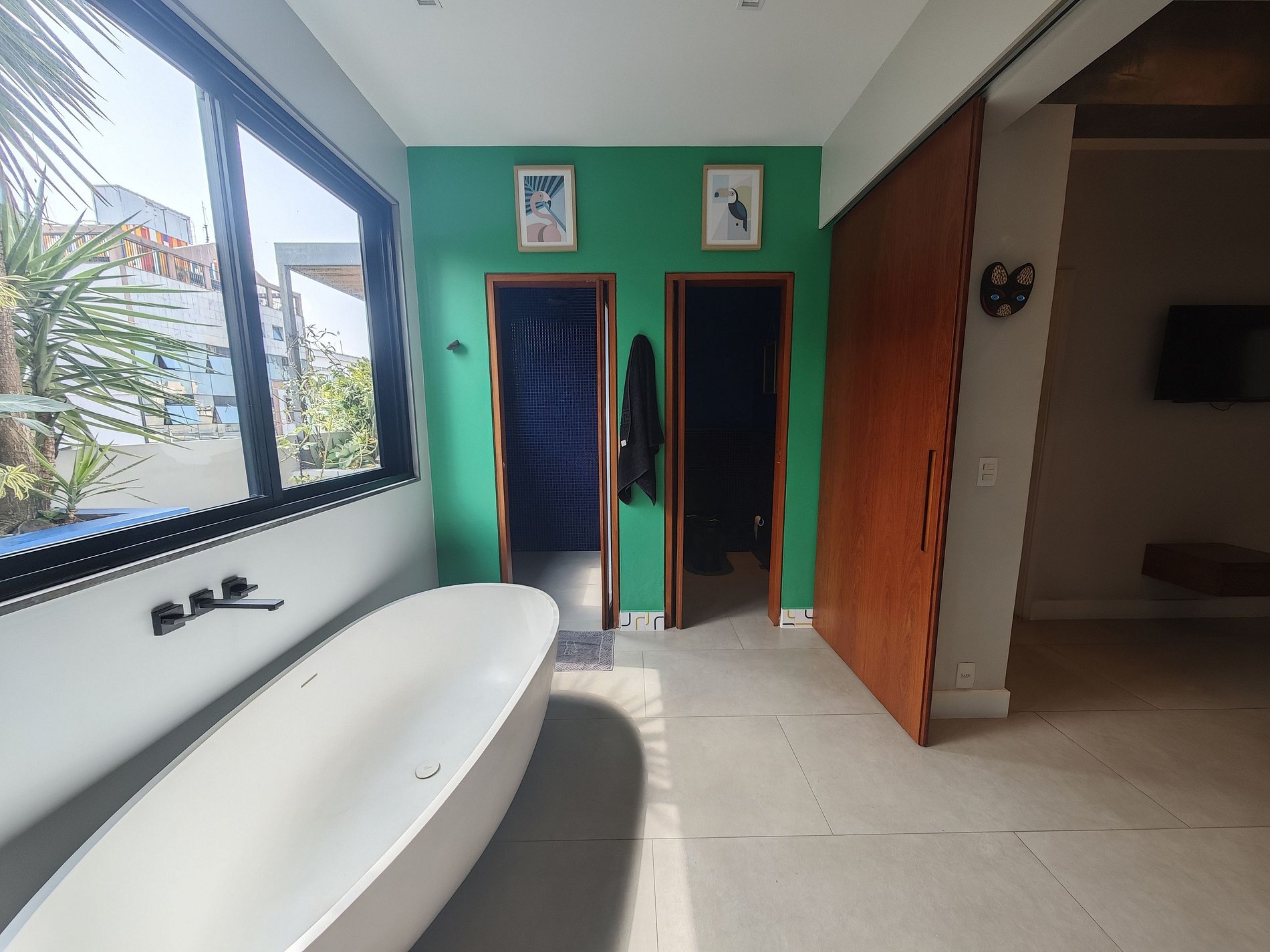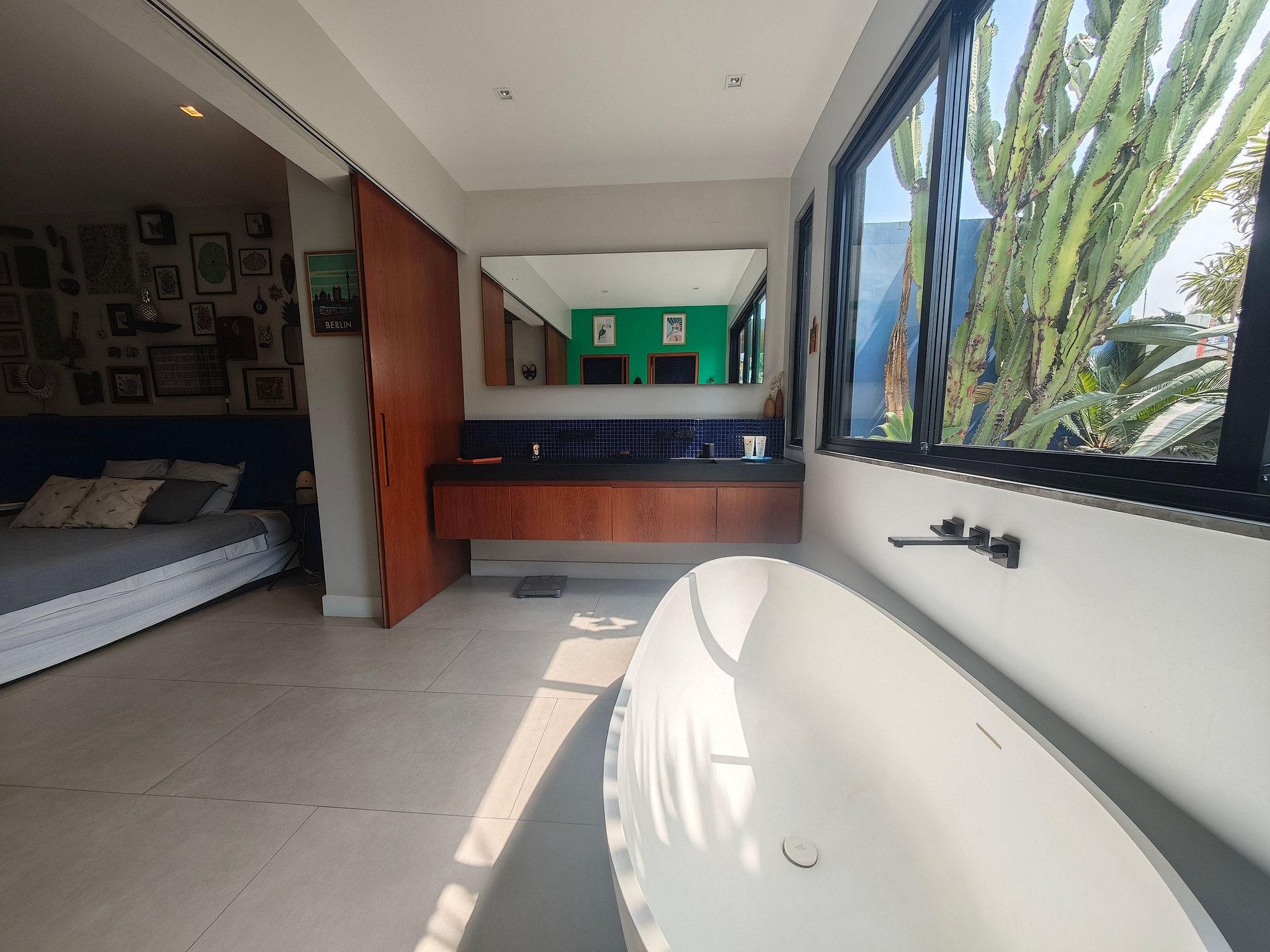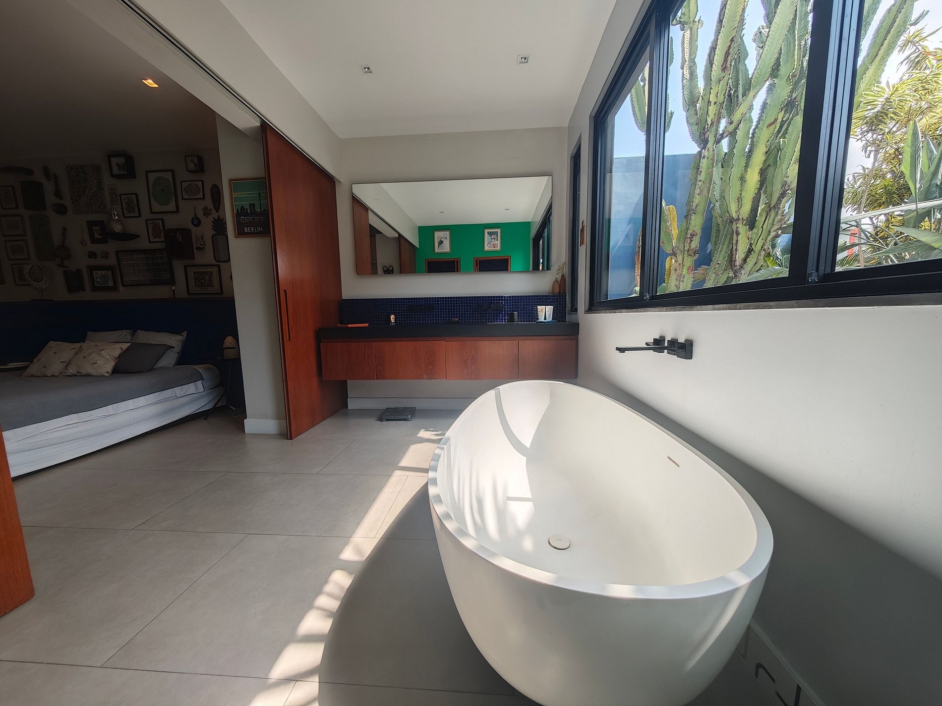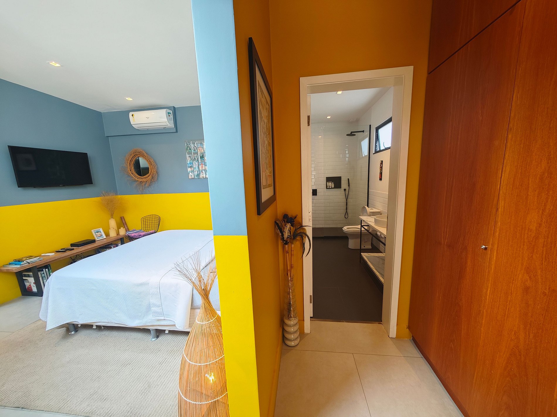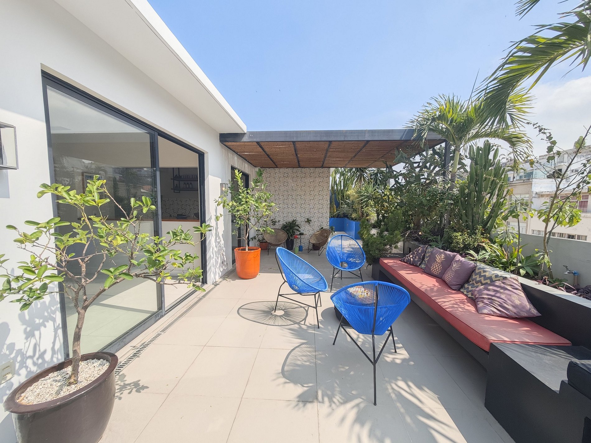 Espaçoso e iluminado, o apartamento convida você a viver tanto em ambientes internos quanto externos. A sala de estar colorida se abre naturalmente para o terraço, enquanto a cozinha totalmente equipada permite que você compartilhe refeições deliciosas em um ambiente acolhedor. Você terá três quartos confortáveis: uma suíte com cama king-size, um quarto com cama queen-size e um quarto de solteiro, decorado com bom gosto, combinando materiais naturais e toques brasileiros.