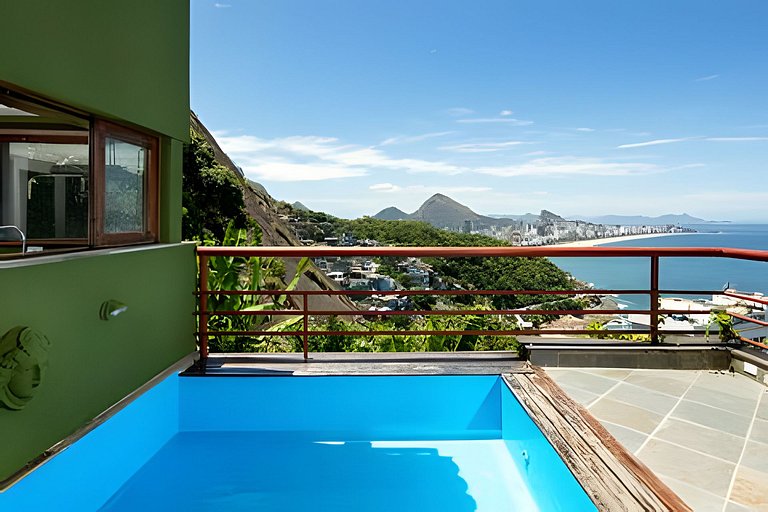 Linda casa localizada em uma rua tranquila no Vidigal, com 2 andares, que pertencia a David Beckham. A casa principal possui uma cama king-size no mezanino, que é o seu banheiro. A sala de estar é enorme e tem janelas amplas e uma vista deslumbrante. Uma cozinha com a mesma vista. Um terraço ao redor da sala de estar com uma pequena piscina e um chuveiro externo. A parte de baixo possui 2 quartos, 2 banheiros e camas queen-size. Possui uma cama de solteiro adicional. Capacidade de 7 pessoas.